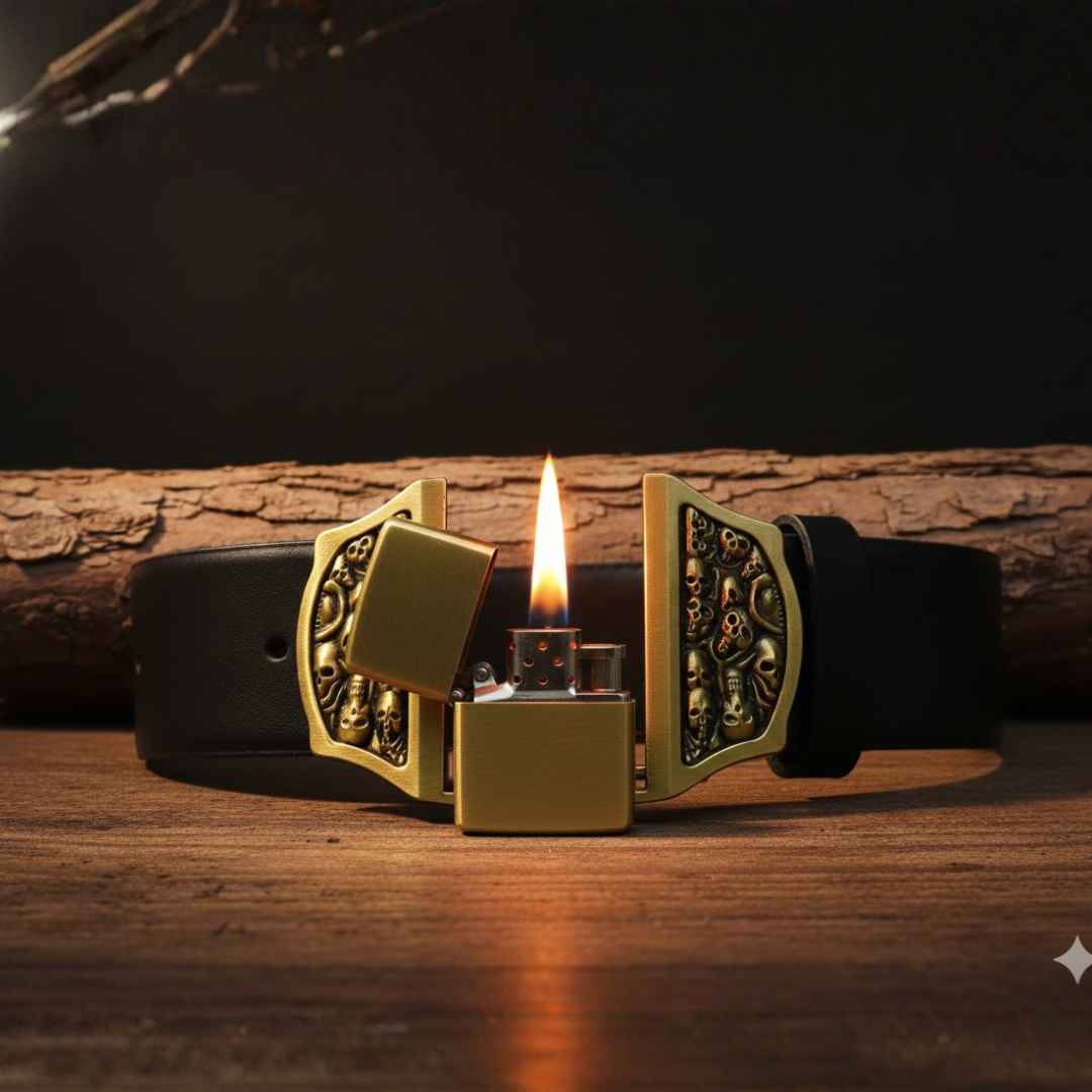 Heavy-Duty Skull & Bones Belt Buckle + Hidden Lighter (Including Belt) — Retro Gothic Metal Finish