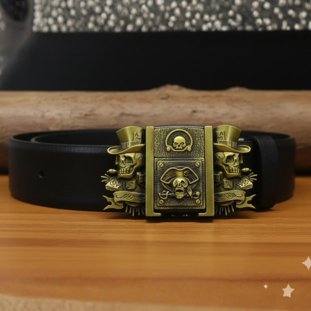 Vintage Pirate Skull Belt Buckle+ Hidden Lighter (Including Belt) — Antique Brass Gothic Design